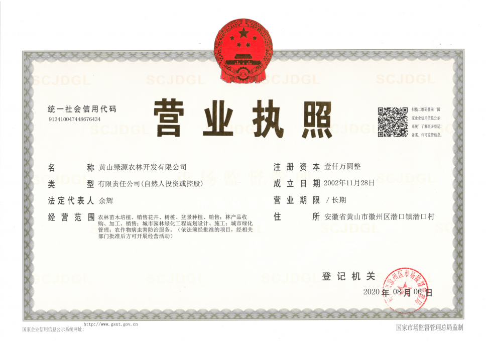 黄山绿源农林开发有限公司创立于2002年,注册资金1000万元,是一家集林木种苗生产与销售、园林绿化景观设计与施工、农林科技咨询与培训一体的综合性企业,又是一处引进、试验、推广“名、特、优、新”经济林的科技示范基地,注册有“徽源”苗木果品商标。